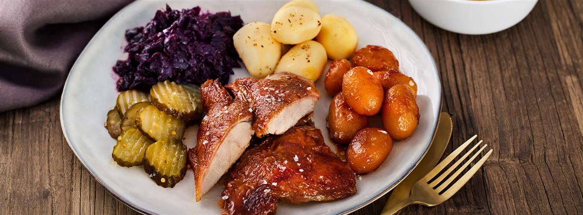 • Kamsteg med rødkål og agurkesalat